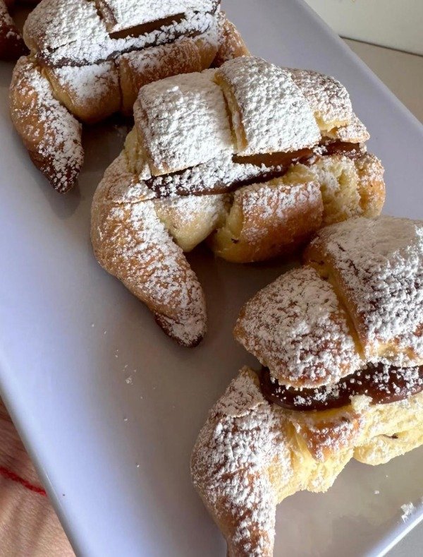 Medialunas rellenas con dulce de leche repostero y agregado de azúcar impalpable